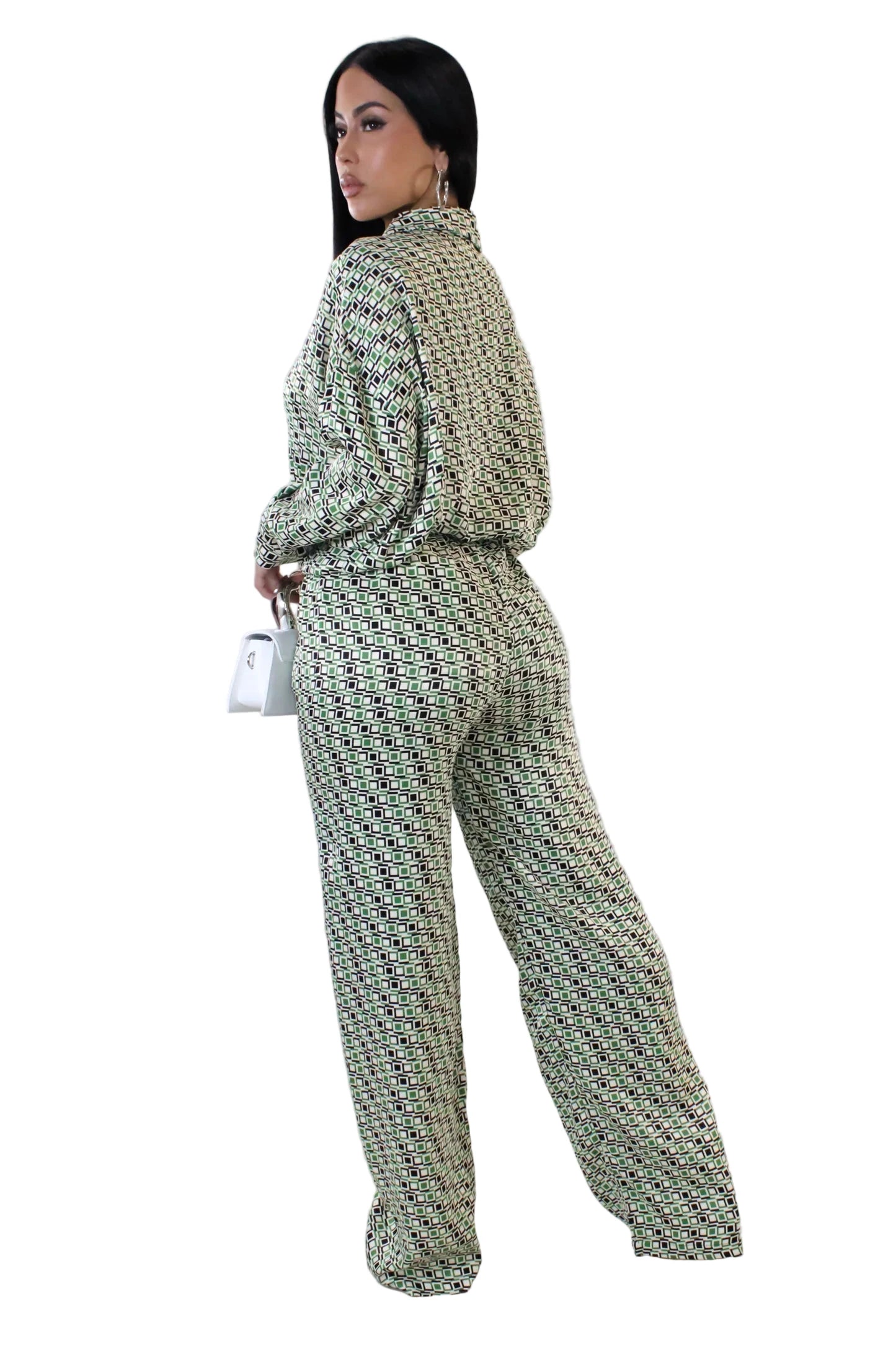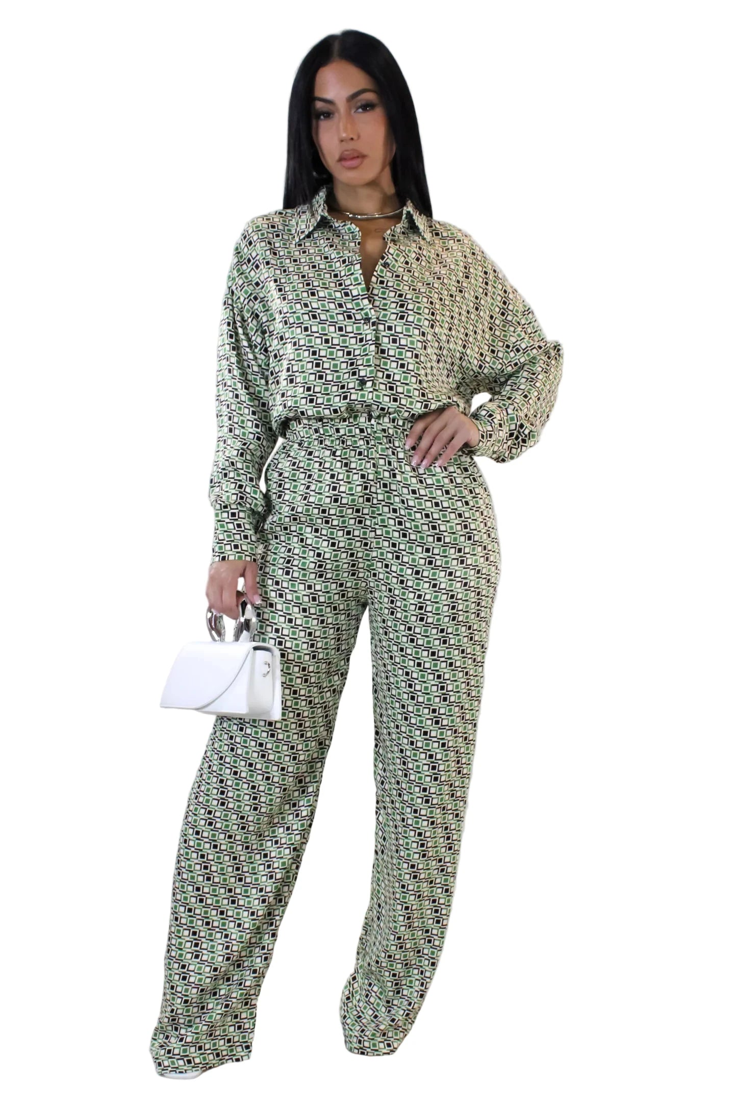 This stunning Soie Rôtie pant set in luxurious green will elevate your wardrobe with its blend of 95% poly and 5% spandex. The minimal stretch creates a sleek silhouette, while the model wears a small, accentuating the figure. Step out in style and sophistication with this exclusive piece.